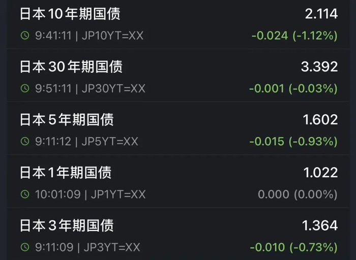 日债收益率全面下跌,日本10年期国债收益率跌至2.114%。30年期日本国债收益率跌至3.392%。