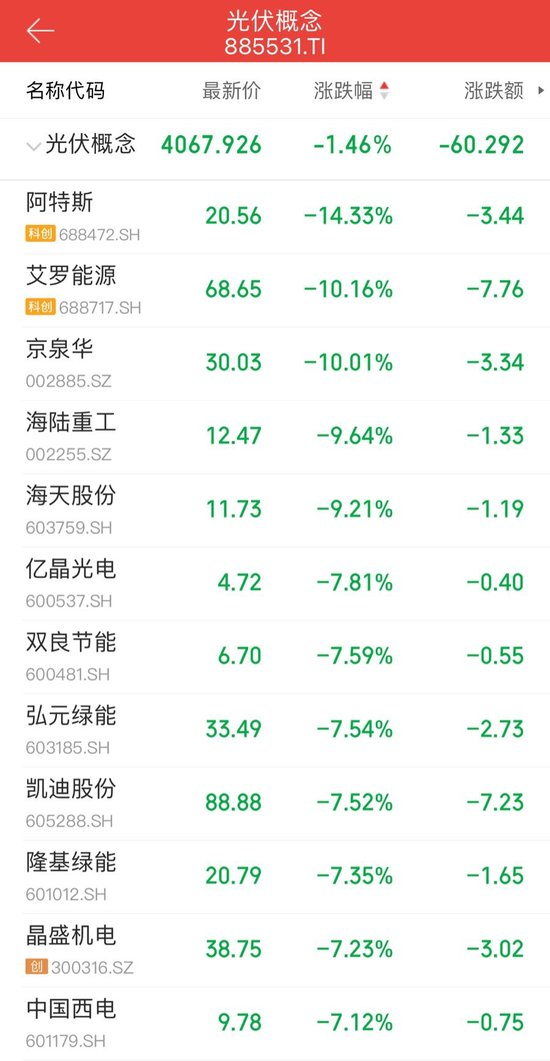 11月12日,A股光伏板块遭遇大面积回调。截至收盘,阿特斯(688472.SH)跌超14%,晶澳科技(002459.SZ)、隆基绿能(601012.SH)、亿晶光电(600537.SH)、双良节能(600481.SH)等个股均跌超6%。