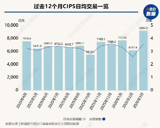 跨境银行间支付清算有限责任公司的网站数据显示,人民币跨境支付系统(CIPS)处理交易额今年3月创下过去12个月以来的峰值,日均交易规模达9205亿元,交易笔数为3.574万笔,较2月的6197亿元和2.593万笔大幅攀升。