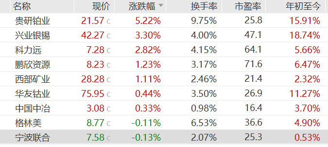 镍相关概念股集体走强。截至1月9日收盘,贵研铂业年内涨近16%,兴业银锡年内涨超18%。